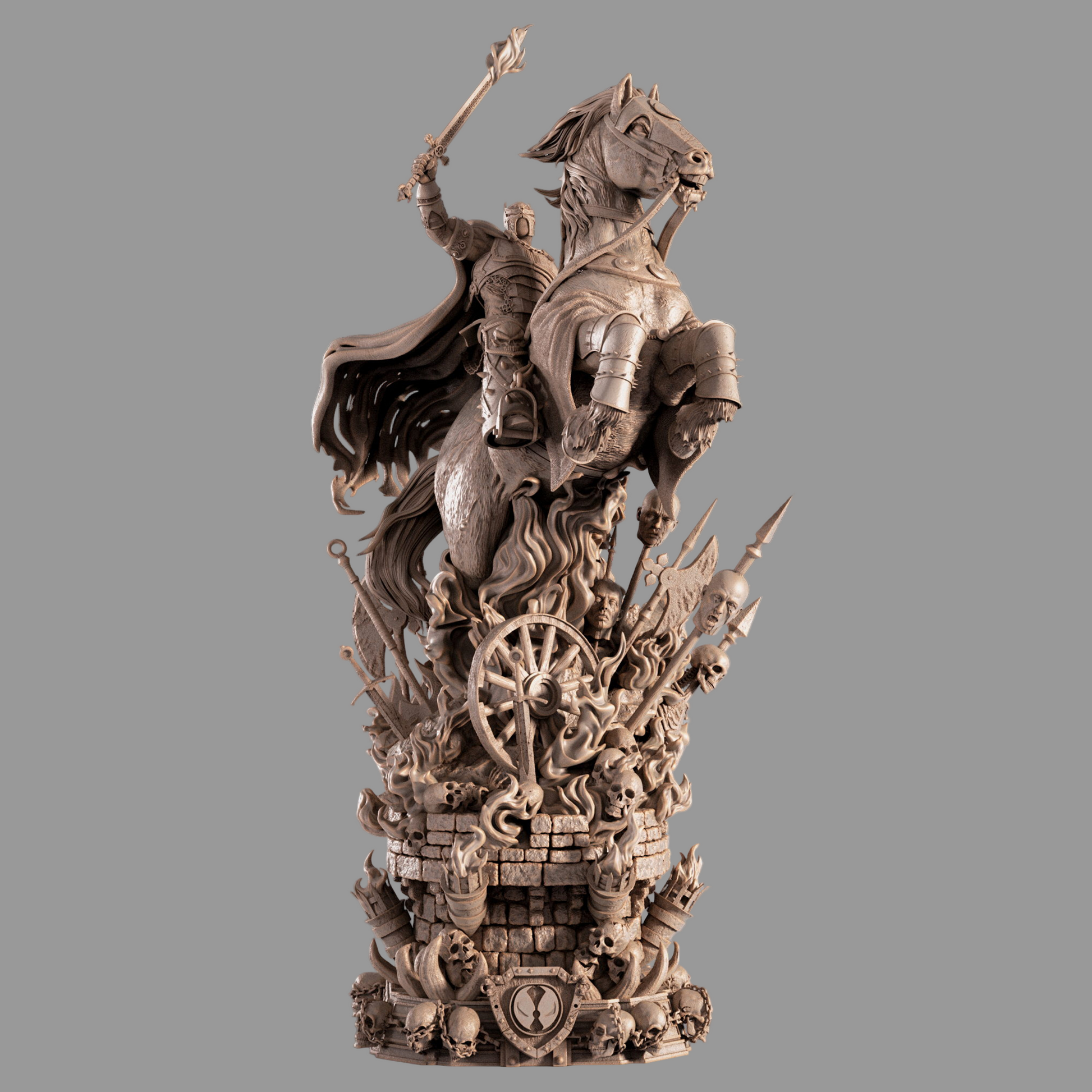 From the depths of flame and fury rises the Berserk Spawn, a towering embodiment of wrath, vengeance, and immortal will. This colossal statue captures a demonic knight astride his infernal steed, wreathed in the chaos of battle and the smoldering remnants of the damned. Spears, skulls, and fire swirl around the rising base, a monument to destruction that refuses to fade into darkness.
