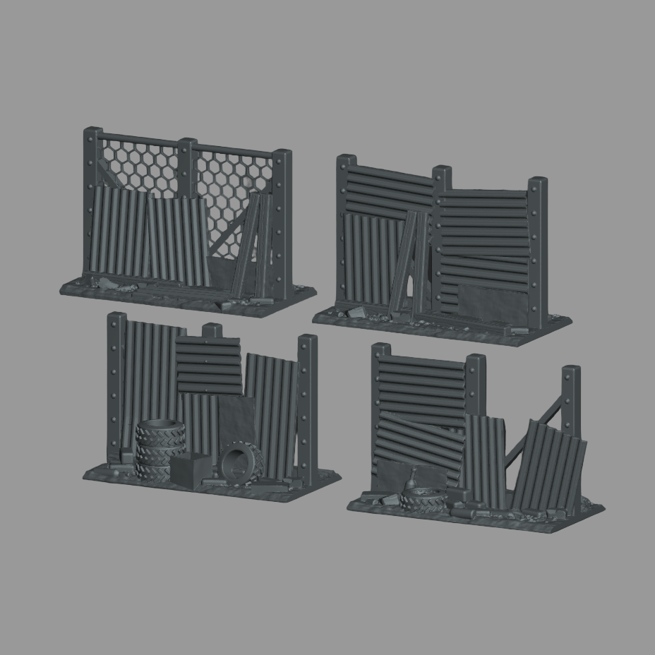 Reclaimed from the ruins of civilization, these Scrapline Defenses bring the raw, weathered look of a post-apocalyptic battlefield to your tabletop. Each barricade is crafted from corrugated steel, mesh panels, and scavenged tires, designed to look like they’ve been welded together by desperate survivors or ingenious raiders.
