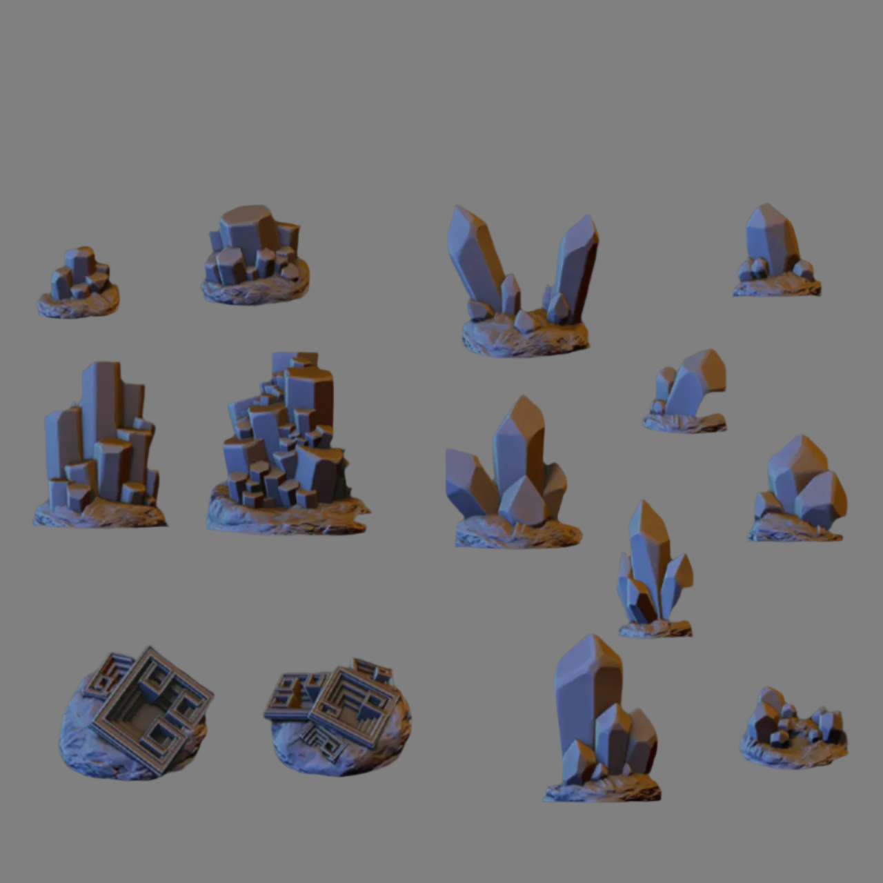 70 (5 Lots of 14 Variant) Varied crystal clusters in multiple shapes and sizes. Polygonal geometric formations for alien or arcane environments, Ideal for scatter terrain, basing detail, or narrative objective markers